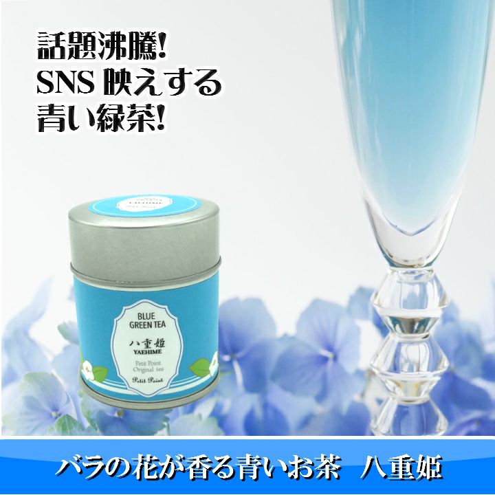 「八重姫」は、天然由来成分が配合された香料を使用した優雅なバラの花が香る青い水色のフレーバー緑茶。