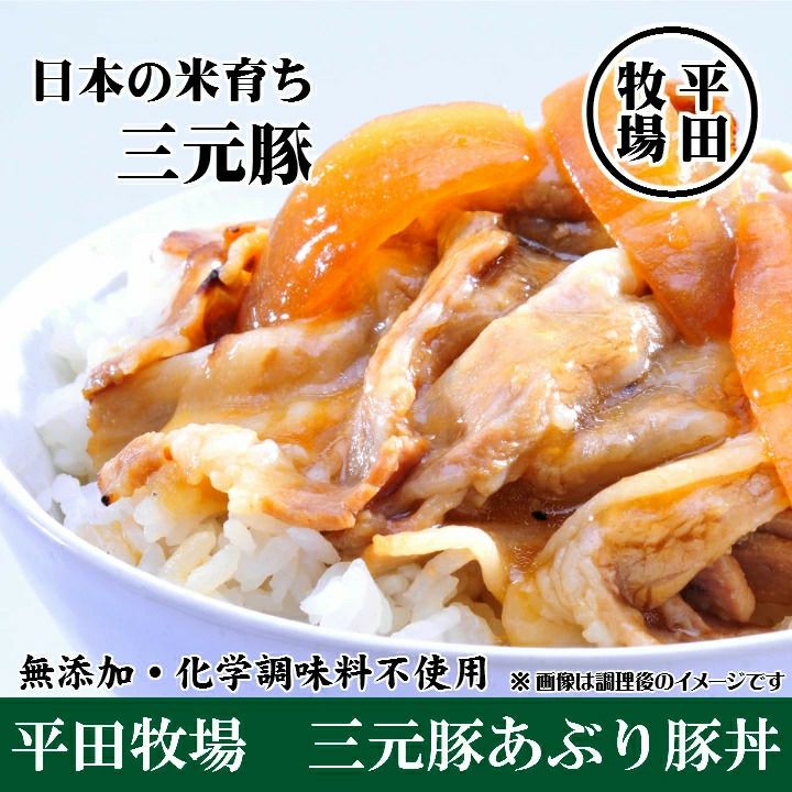あっさりとしてコクのある甘さ、しっかりとした弾力が特徴の平田牧場三元豚を、一枚一枚丁寧に直火で炙り、玉ねぎとしょうゆベースの無添加ダレに漬け込んだ、平田牧場オリジナルの豚丼です。